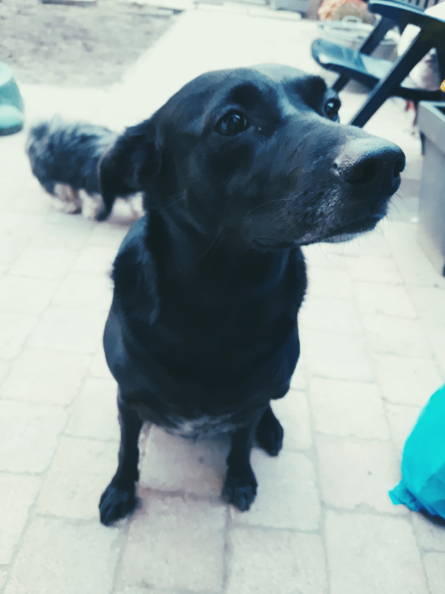 De border collie zie ik er niet zo zeer in. Eerder zou ik zeggen een kruising tussen een lab en een herder. Maar die herder zie ik er zeker wel in terug!