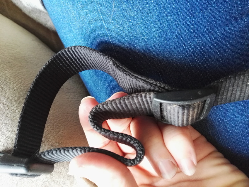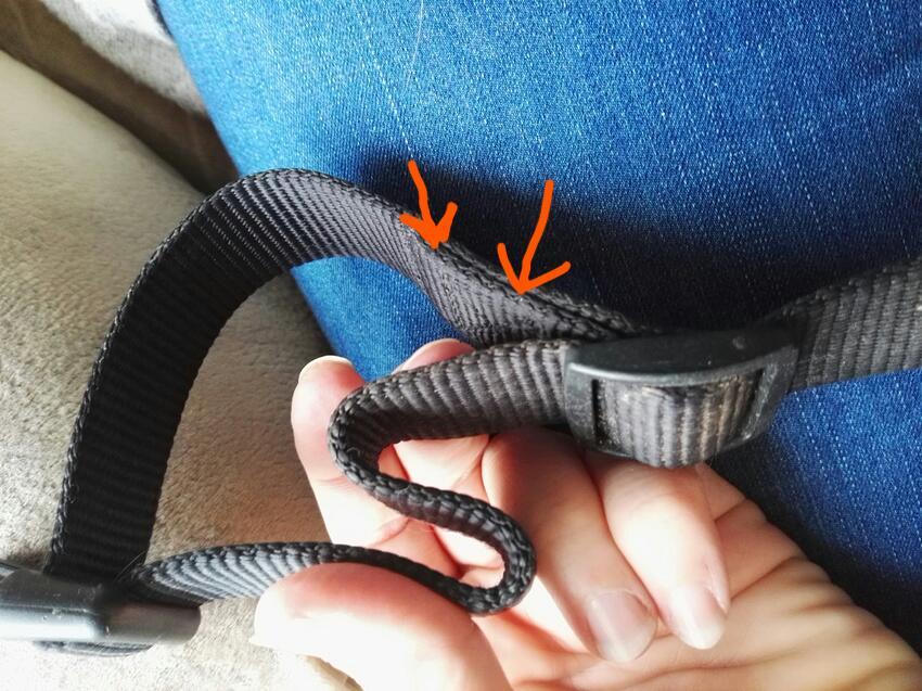 Ergens zit het bandje dubbel gestikt als lusje(waarschijnlijk om 1 van de stukjes van de sluiting of misschien onder de rugband waar het halsbandje kruist