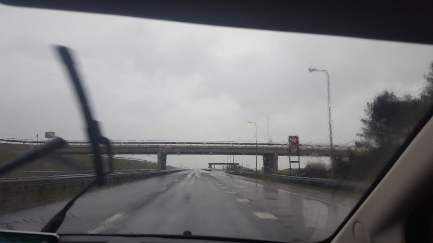 We zijn onderweg en rijden nu op de afsluitdijk. Isa ligt rustig en heeft bruine boterhammen op. Het weer is niet best maar dat heeft ook wel weer wat....