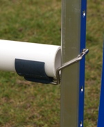 Maar misschien gewoon 2 latten/balken in de grond duwen, daarop een stok/bezemsteel/gordijnrode. Die je vastlegt op zo'n dingetje - lepel - (dat als Tommy er tegenaan komt, de stok eraf valt)