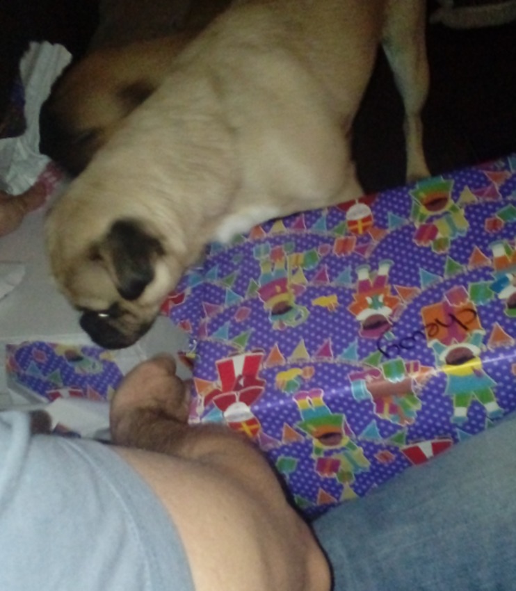 Chewy was zeer nieuwsgierig naar zijn cadeaus..