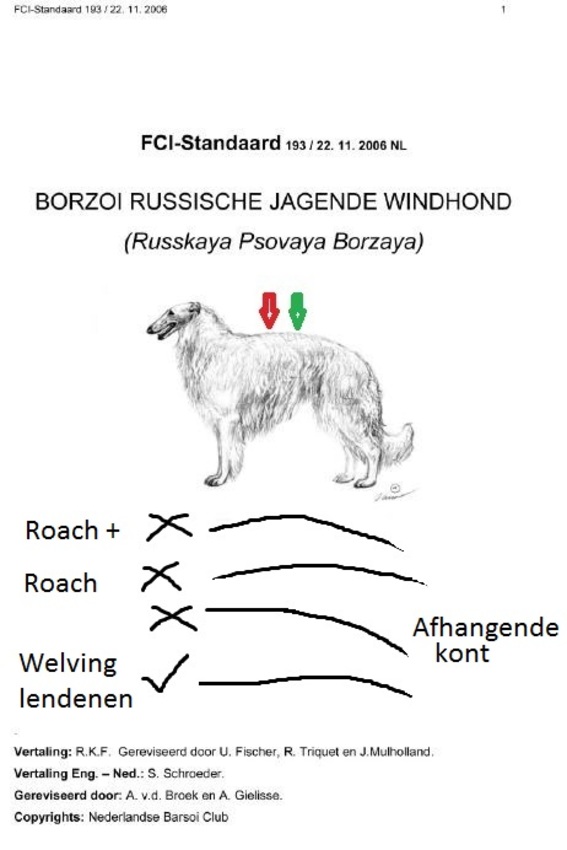 Als ik een borzoi mooi vind, vind ik hem echt het einde! Maar te vaak zie ik een borzoi dat ik denk.. nee, teveel fout in het uiterlijk. Dan hebben ze bijvoorbeeld een overdreven downface, een overvloed aan haar, of het ergste en wat ik het meeste zie: een afhangende kont, of een opgetrokken rug (roach). Dat hoort niet maar veel mensen... fokkers/keurmeesters... vinden blijkbaar dat het gewenst is. In de standaard staat toch heel duidelijk: