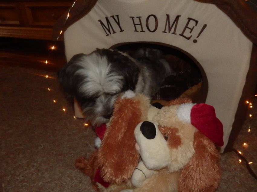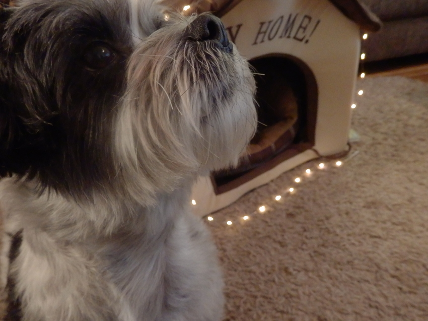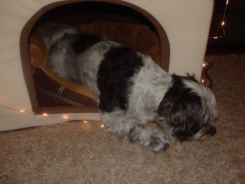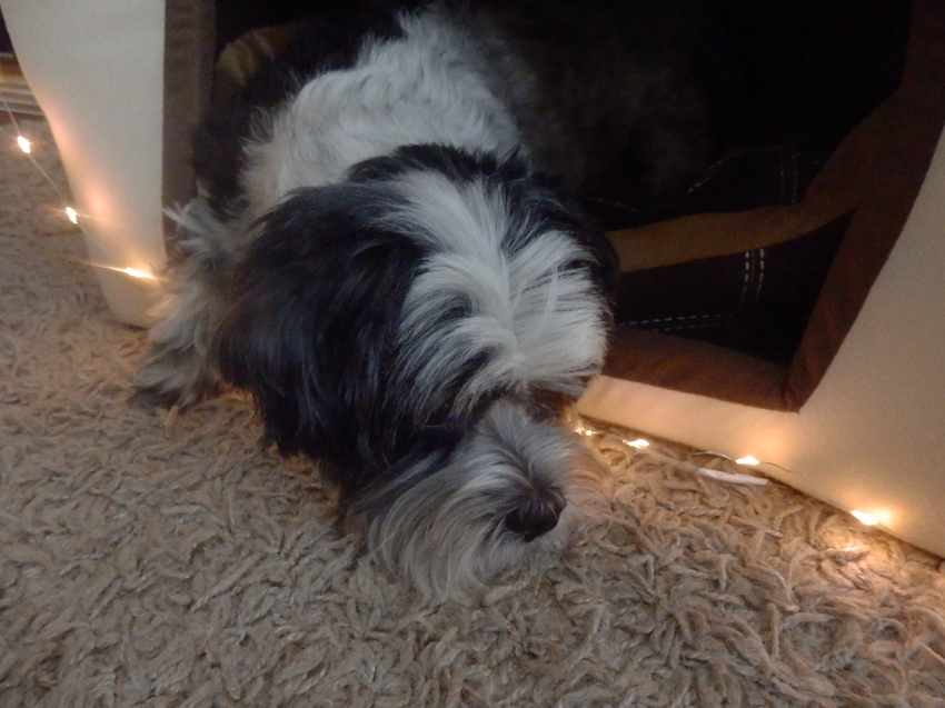 Ik kreeg het idee om het stoffen huisje van Spaiky in kerstsfeer te brengen door het te versieren met een kerstverlichting.