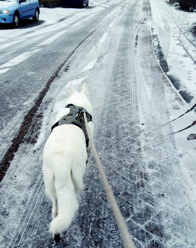 Hier vandaag weer normaal kunnen wandelen. Nog wel erg glad op vele wegen maar wel goed te doen. Dus op de voetzooltjes van Shadow spray gedaan tegen het zout en lekker gegaan. Lag ook nog wel wat sneeuw dus ze had veel plezier.