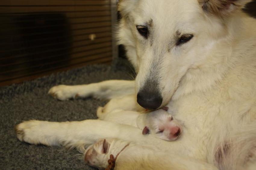 en wat heeft de mamma een prachtige kop zeg, fijn dat ze een goede zorgzame moeder is, krijgt je pup een prima start mee![]()