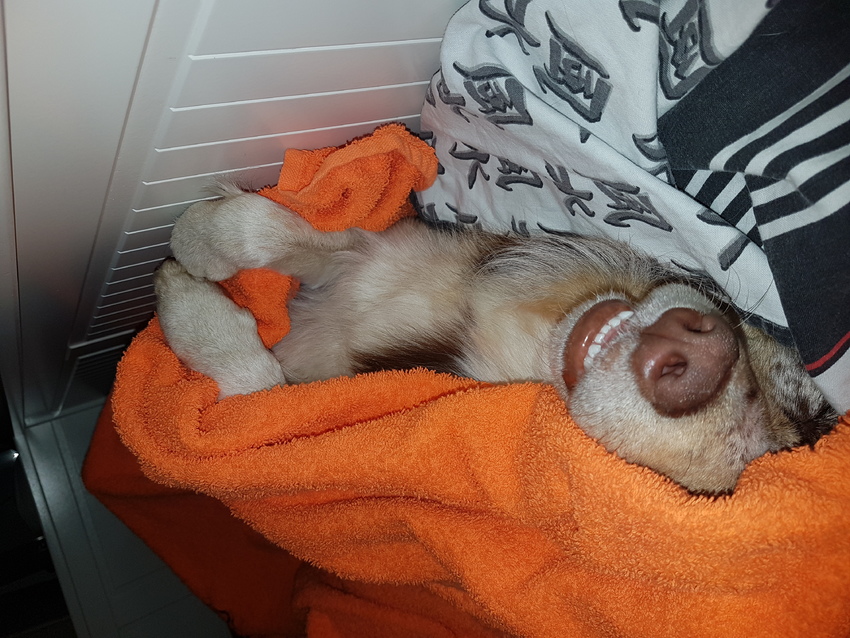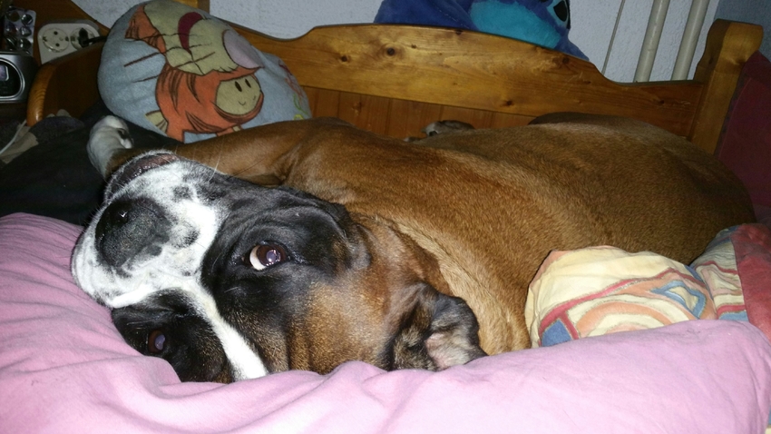 Ik dacht dat ze een leuke droom had en daarom kwispelde, totdat ik een soort van boerenkool rook onder de dekens. Ze waaide hem gewoon door heel mijn bed heen met haar staart.