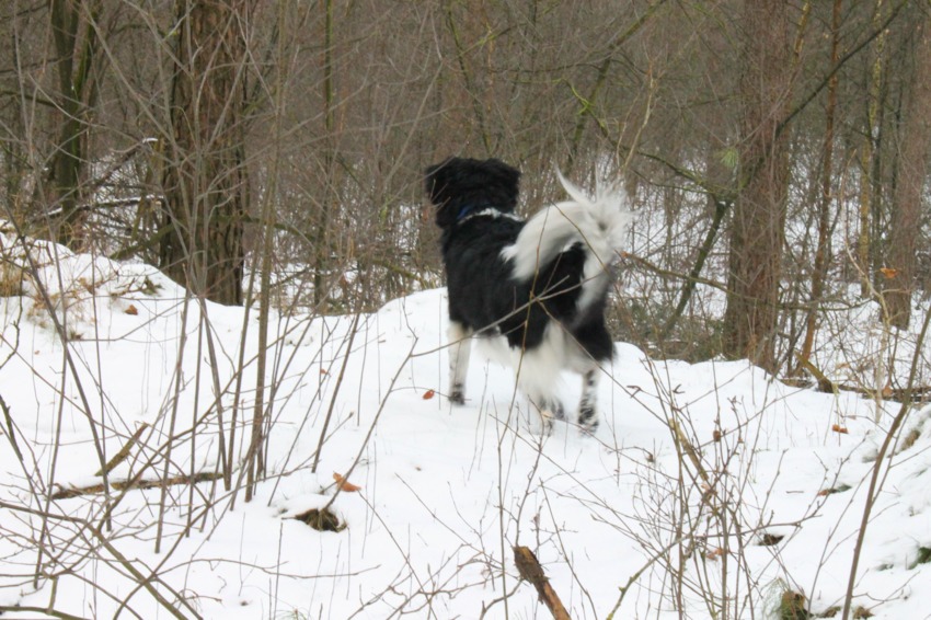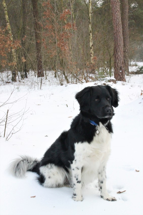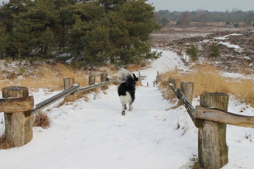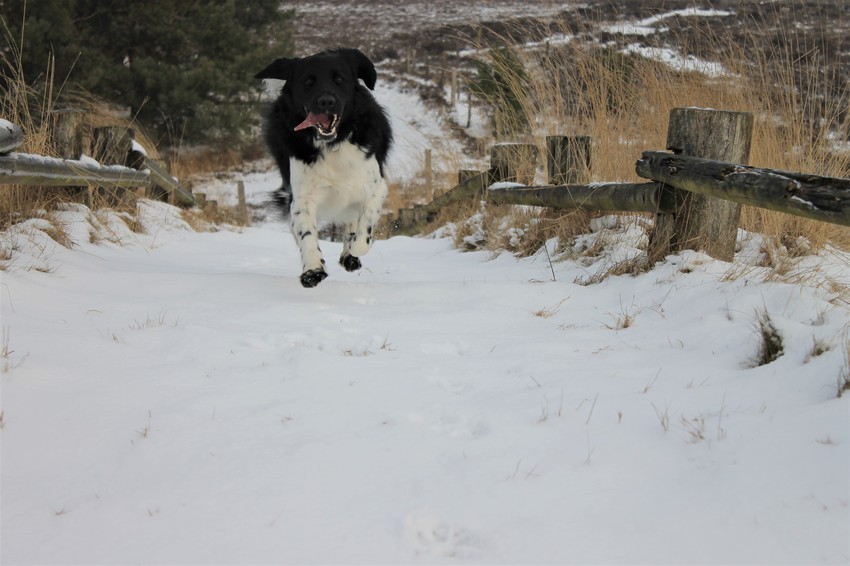 Jaaa! In het bos rent hij altijd en nu nog harder met die sneeuw