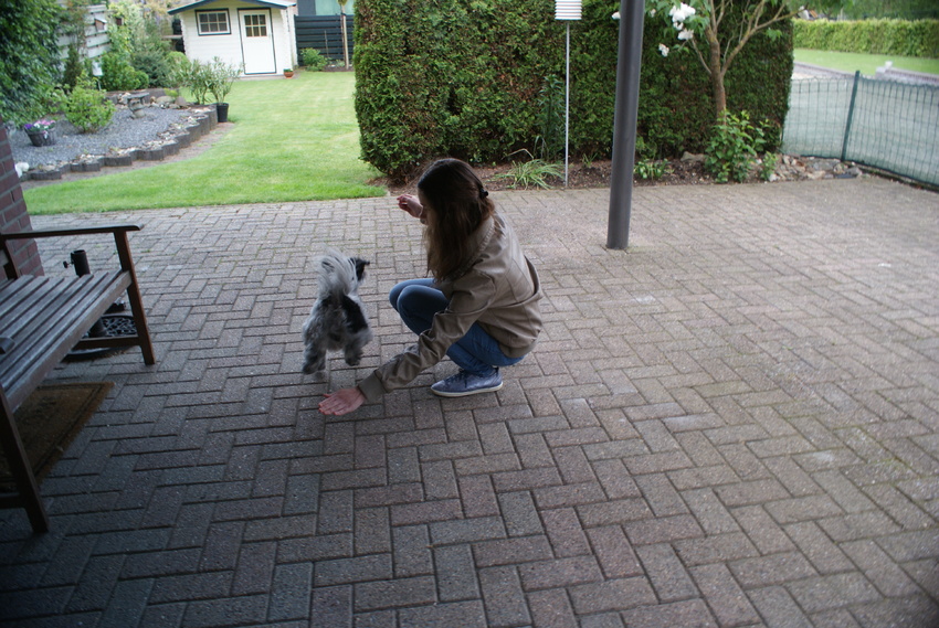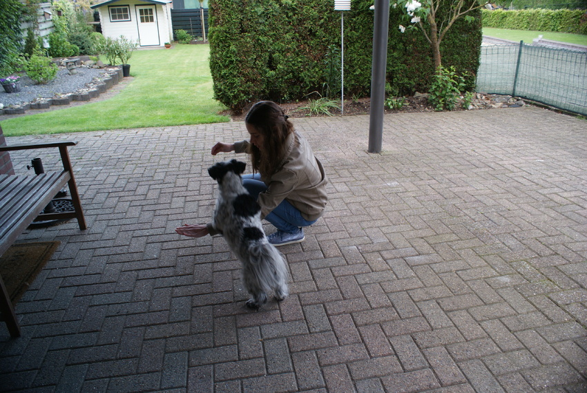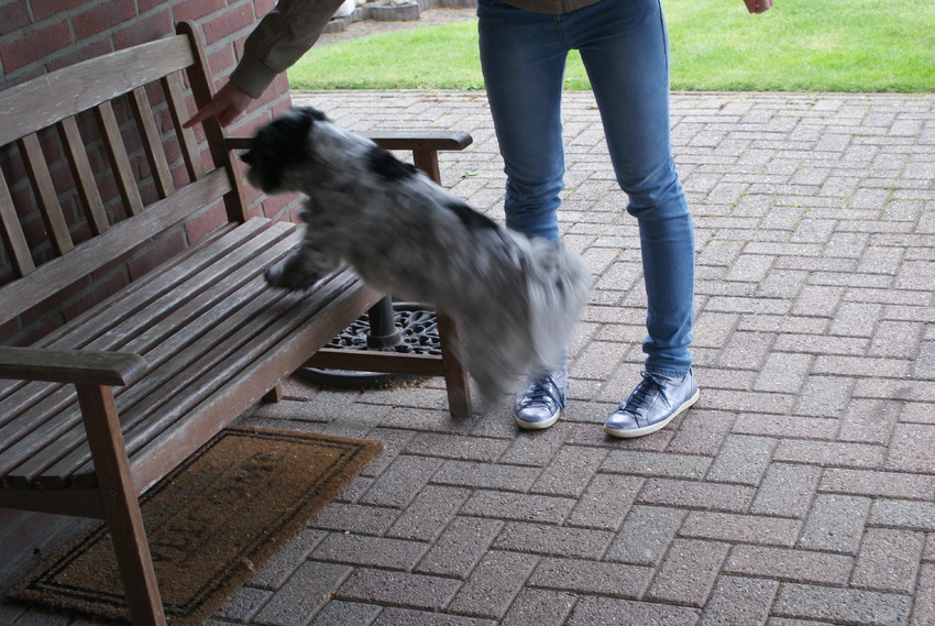 En op commando zich uitschudden kent hij nu ook. Dit vind ik handig als hij in bad is geweest of ergens heeft gezwommen en anders zeiknat mee moet. Geef het commando en hij schudt zich uit.