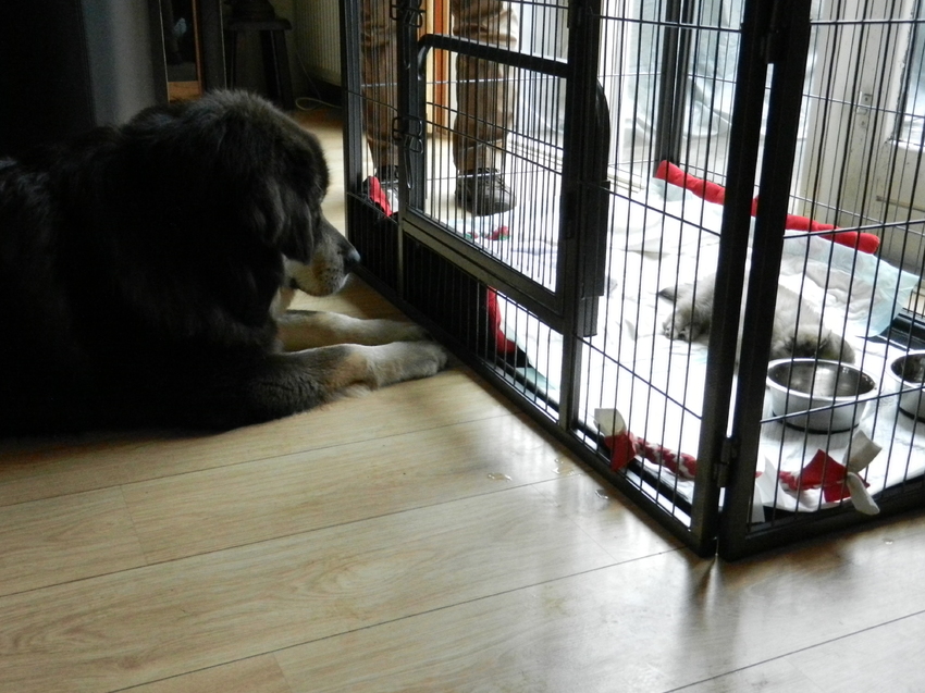 Balou is nog steeds wat onwennig en schrikachtig tegenover Lotus maar ze hebben vanmiddag even samen gespeeld. Als ik Lotus aan de riem in de kamer liet lopen sprong Balou gelijk op de bank of hij ging zijn bench in. Ik heb het deurtje van zijn bench dicht gedaan en de slang en buis van de stofzuiger op de bank gelegd (hier is Balou bang voor) dus hiermee heb ik Balou zijn vluchtwegen afgesloten.