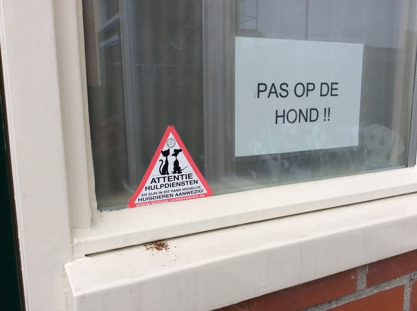Bij de sophiavereniging kan je een sticker bestellen dat er mogelijk huisdieren aanwezig zijn. Die had ik altijd op de deur, moet er nu weer 1 bestellen omdat we verhuisd zijn