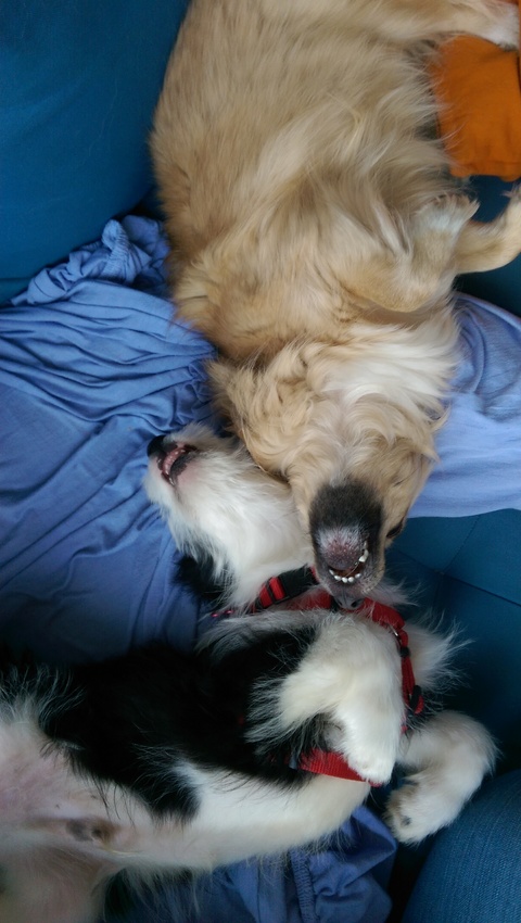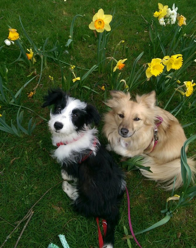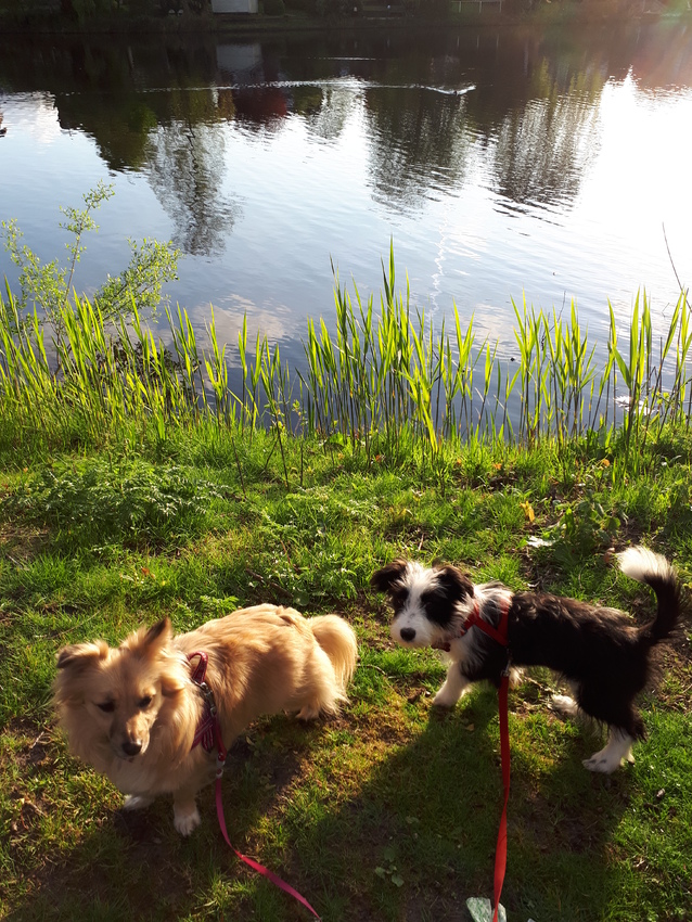 Ze stoeien graag samen, wandelen als Jut en Jul en elkaars oren worden uitgebreid gewassen. wanneer de een aandacht bij me komt halen wil de ander ook gelijk maar die moet dan maar even wachten. Zo ontstaat er steeds meer rust en minder jaloezie tussen de twee.