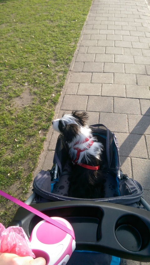 Zo ging hij na de eerste week mee in de buggy omdat Lupa en ik onze lange wandelingen begonnen te missen. Cody hing er als een echte hangjongere in hihi. Onderweg stukken zelf gewandeld en nog even in een hondenbak gerend.