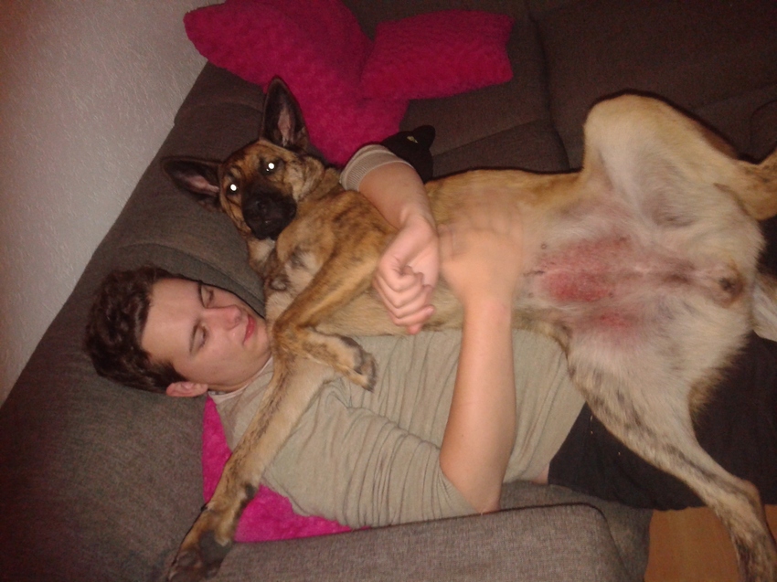 Bij Kahlúa uit het zich echt in vuurrode plekken, en open wondjes die kunnen ontsteken. Vooral op haar buik, benen en oksels zijn het ergst. Ik heb voor en na foto's maar ik ben nu niet thuis. Hier wel een foto dat ze met mijn neef aan het knuffelen is, hier was het alweer kouder aan het worden, had ze weken aan prednison gezeten en was het al een stuk minder dan voorheen, maar alsnog behoorlijk rood.