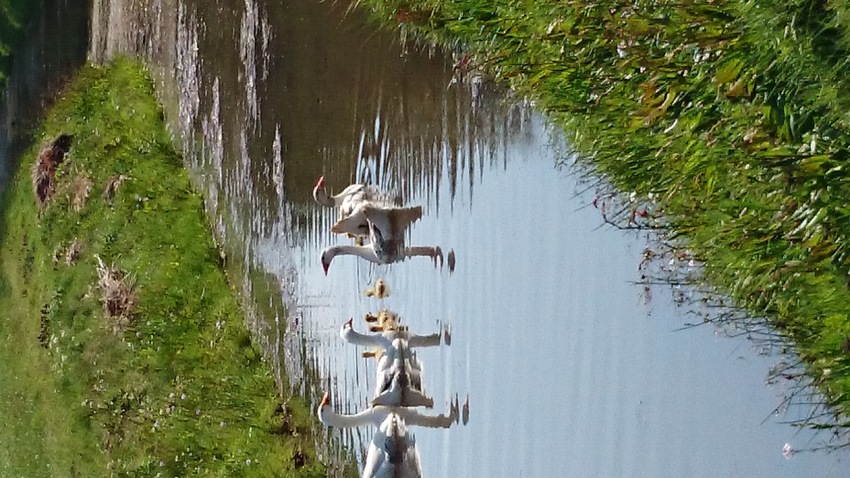 Wij hebben in reutum gewandeld vanmiddag. Langs een beek met vier volwassen ganzen en een paar kuikens. Ze bliezen wel flink toen we langs kwamen lopen, maar zwommen verder toen wij ze gewoon voorbij liepen.