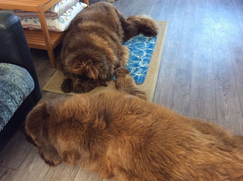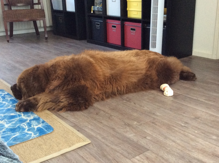 Bams heeft de zomervacht aan....en hier een koele plek zo voor de waaier, wel zorg ik er altijd voor dat ze niet met haar ogen in de wind ligt......