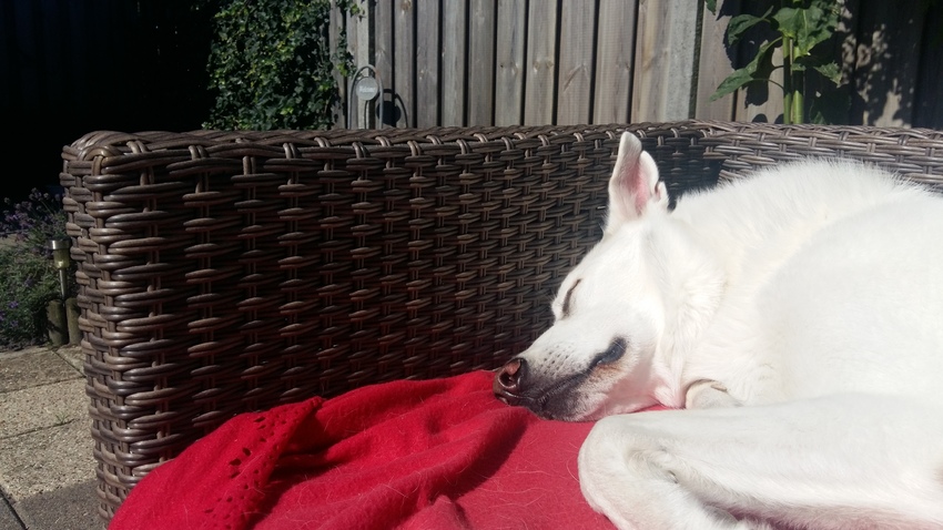 Wat heerlijk is een hond toch......warm, hier ook maar in het noordoosten zal het best een paar graden aangenamer zijn dan bij jou.