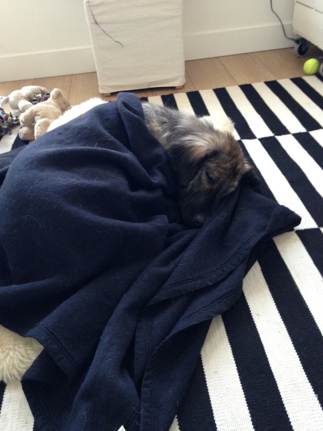 Als er iemand denkt wat ziet zijn vacht er raar uit, hij was hier nog herstellende van de demodex. Maar sindsdien dol op dekentjes, zelfs nu met zijn berenvacht ![]()