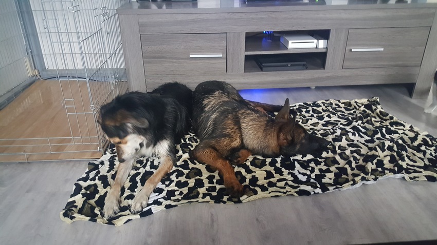 Het lijkt erop dat ie zich overgegeven heeft in de bench. Met weggaan en thuis komen is stil tot je binnen komt. We negeren hem tot hij stil is en dan nog even negeten tot ie rustig is, want hij is natuurlijk heel blij ons te zien. We gaan de draadbench weer neerzetten maar dan met een laminaat vloertje erin. Is toch wat meer vertrouwde ondergrond, hij slaapt ook niet op de bank maar op het laminaat, maakt minder herrie dan die ijzeren plaat en hij heeft nog meer ruimte dan in de reisbench. Nu alleen nog uitvinden of ie blaft als we weg zijn. Maar het gaat de goede kant op.