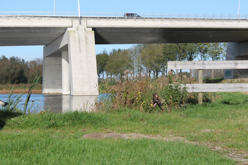 Helemaal niks. Hij heeft geen oog voor je. Ook zoeken op de grond, wat bij veel honden werkt, helpt ook niet. Hoop dat het er snel uit is. In het bos hierachter kan het gelukkig geen kwaad en veel loslopen doet hij niet. Maar zoals op het strand is een lijn heel vervelend en dan is ie ook gewoon pleitte.