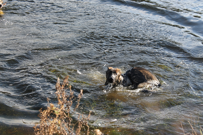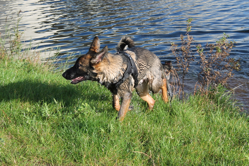 Op de training gaat het super goed, nergens bang voor, erg leergierig én nieuwschierig. Pakt alles snel op en heeft er altijd zien in. Het blijft nogsteeds bij 'grondwerk' en commando's, want springen, daar zwemmen en op het pak mag ie nog niet.
