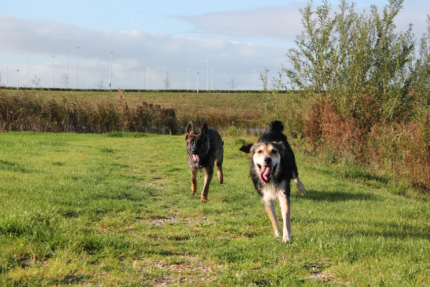 Hij heeft vorige week lekker lopen spelen met andere honden, waaronder een herder kruising, sint bernard en een franse bulldog. Geen haantjes gedrag en erg vriendelijk, super blij mee natuurlijk!