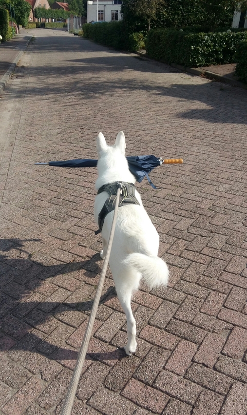 Wij net een grote ronde door het dorp gewandeld. Ze zijn bezig voor de wielerronde op te zetten voor morgen dus er was heel veel te zien in het dorp. Daarna meteen de dierenwinkel meegepakt voor wat lekkers. Ik had de paraplu bij want er zou regen komen maar die bleef weg. Dus Shadow heeft de plu een deel gedragen.