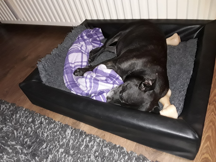Wat wil een hond nog meer... een zalig Biabed, een dekentje.... nog een dekentje, een knaagbeen... nog een knaagbeen... en dan heerlijk relaxed een tukkie doen... ik zeg 'niks meer aan veranderen vanavond' ![]()