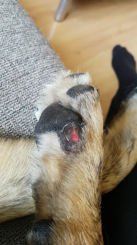 NU ontdek ik pas dat haar voetkussen open ligt, zo sneu! Ze heeft er ook echt veel last van. Voorlopig maar rustig aan doen