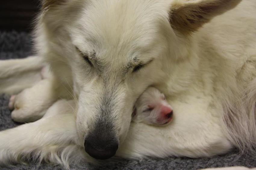 Nee, mams is een zuivere Zwitserse witte herder, net als de pa. De oortjes komen recht rond week 7/8.