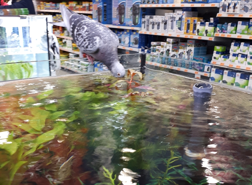 Hij komt gewoon als je aan de bali staat drinken in de aquariumplanten bakken. De bali staat vast aan de aquariumplanten.