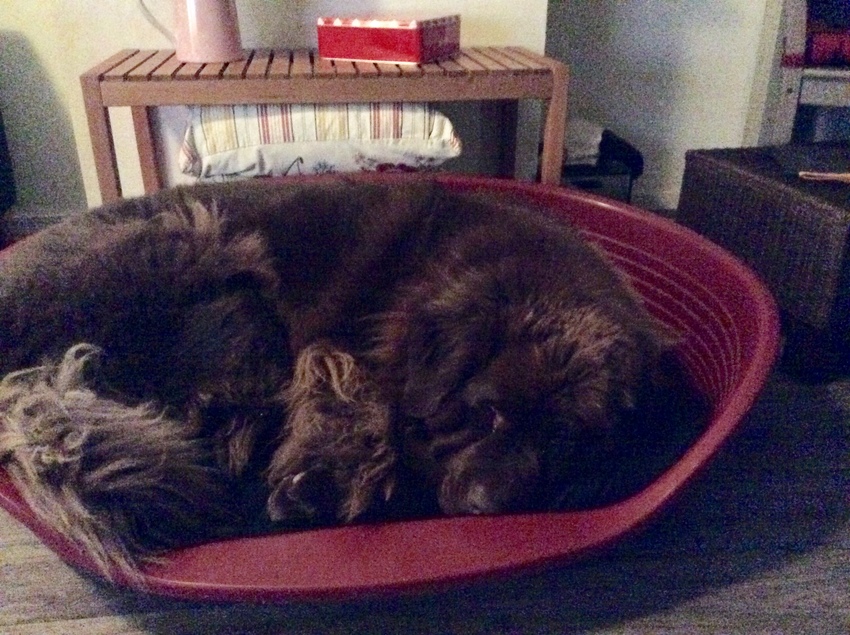 Niet koud, buiten, ook binnen niet, hier gegeten en uitgeweest, nu uitbuiken, wat is het toch heerlijk om hier hond te kunnen zijn, hahaha, en ik nu koffie.