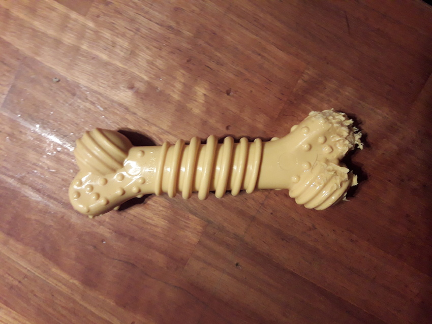 Ik begreep dat nylabone vrijwel onverwoestbaar is. Ziva is een flinke knauwer. Op onderstaande foto kun je zien hoever ze in 10 minuten is gekomen.