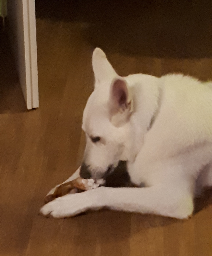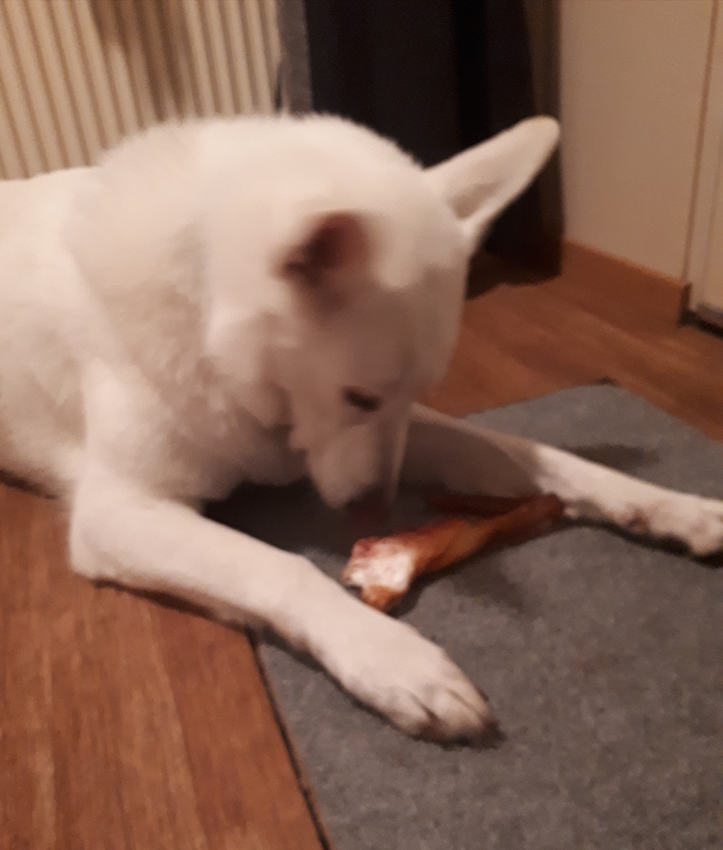 Ze is al lekker een kwartier aan het knabbelen. En ik moet zeggen het ruikt nog lekker ook de spier. Is net een lekkere vleesgeur wat er af komt. Zou hem ook zo lusten