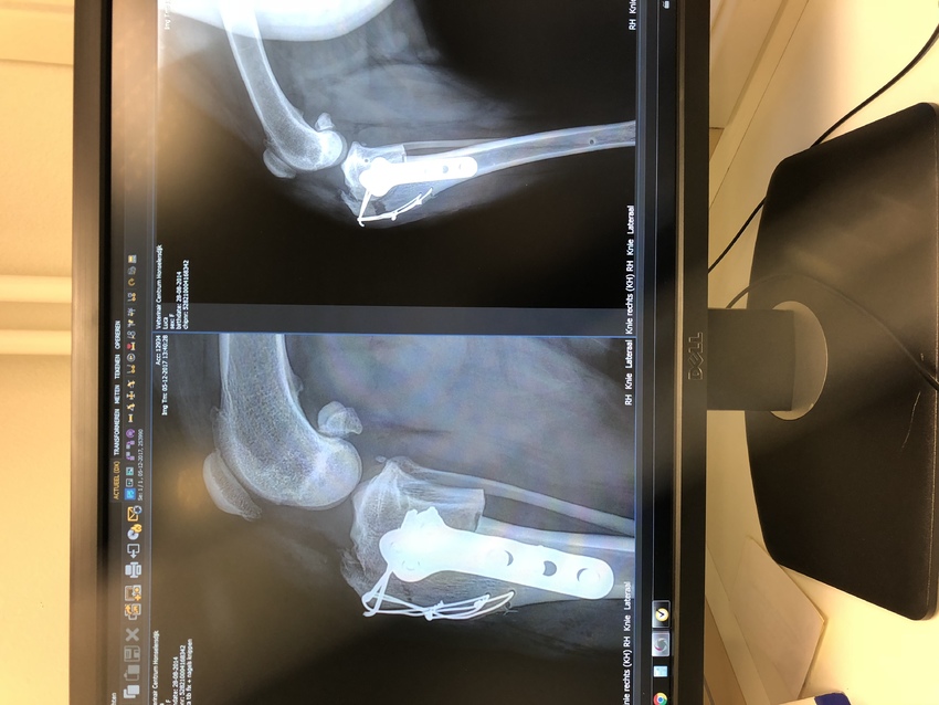 Nou ik ben geweest en een beetje gerustgesteld.. het geknak komt uit het andere eerdere geopereerde been en kan geen kwaad is gewoon waarschijnlijk een pees wat over een botje heen gaat omdat ze die poot nu meer belast, er is een controle foto gemaakt en daar was op te zien dat de breuk wie gehecht is 2 keer dubbel met ijzer hecht draad nu 5 millimeter was uitgerekt de DA was helemaal verbaast over hoe een sterke hond het is en hoeveel kracht ze in die poot heeft want die kans was eigenlijk minimaal omdat hij het 2 keer extra had vast gezet. Nu is gelukkig 5 millimeter maar minimaal en heb ik het advies gekregen om haar nog een week zo rustig mogelijk te houden en andere week dinsdag een nieuwe controle foto te maken of het niet verder is uit gerekt want dat mag absoluut niet gebeuren.. ik heb ook foto’s maar het lukt me niet om ze te uploaden