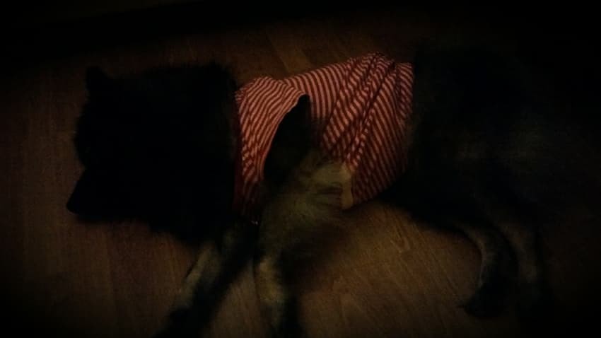 Daarna reageerde je nog al heftig op de vlooiendruppels, maar dat hebben we weer gezellig opgelost, je kreeg een pyjama aan tot t weer over was. Dat vond je helemaaal geen probleem, ik denk dat je t eigenlijk wel lekker vond.