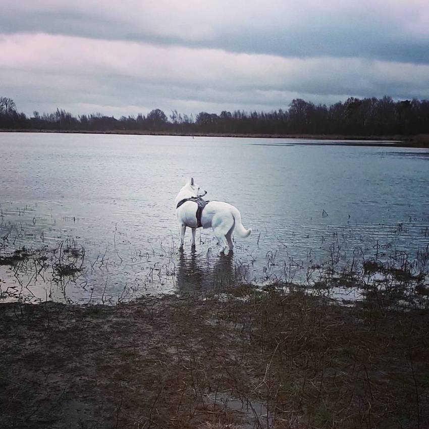 Wat blijft Shadow schoon, ben heel blij dat er straks na de wandeling zwemmen er bij zit, spoelen voor ogin in de auto mag......de wandelin van beiden kort gehouden vanochtend.....half twee ga ik weg, niet te ver, klein half uurtje rijden....en hoop wel op tijd terug te zijn voor bams voor het losbarst.......