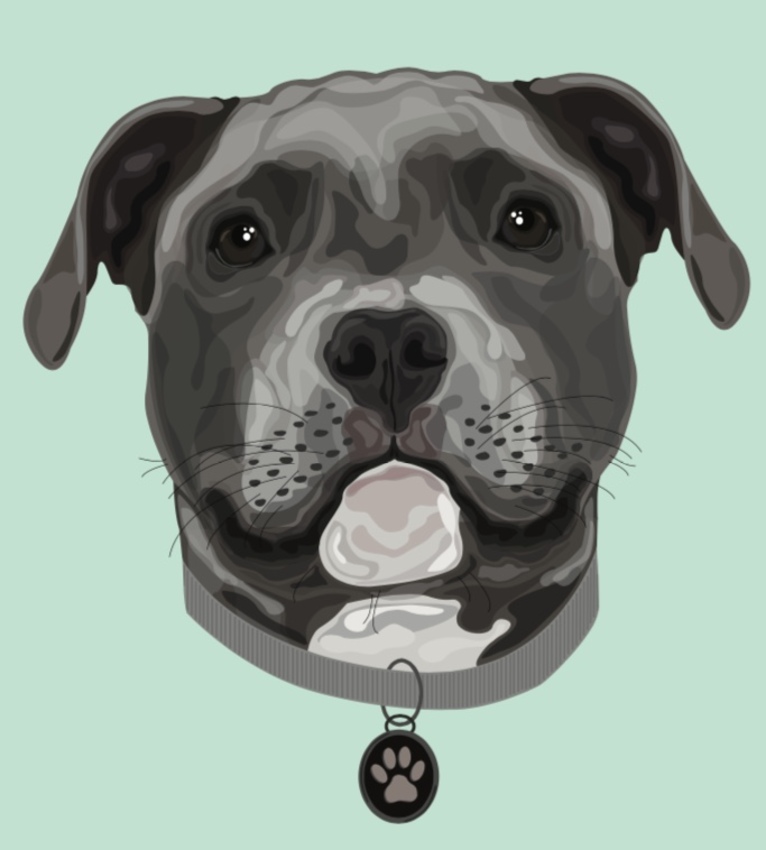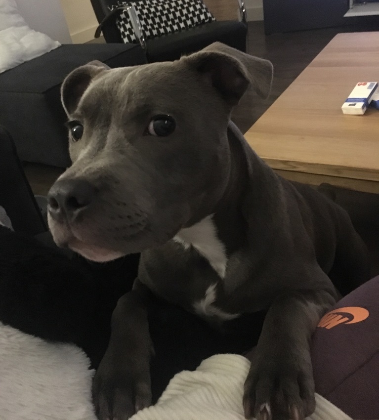 Wat een mooie hond. Wat is het? Lijkt pitbullerig, maar dat zie ik vaak mis...