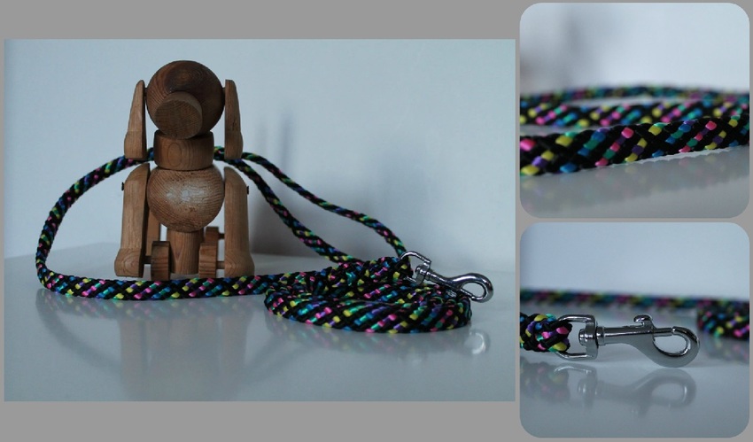 Vrolijk lijntjes met een musketonhaak van 6 cm. Het disco lijntje (zwart, geel, roze, groen en blauw) is 170 cm lang inclusief het handvat.