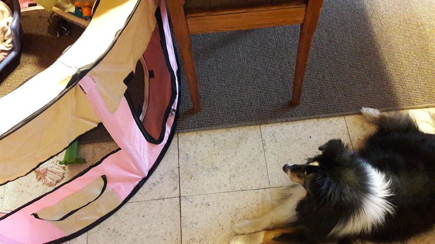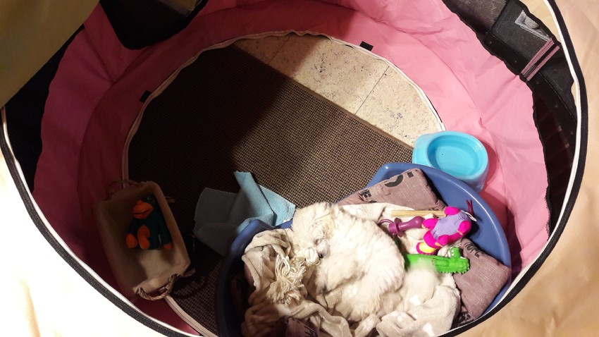 Dat van die plek om zich terug te trekken snap ik niet goed. Die puppy kan er dan toch achteraan?