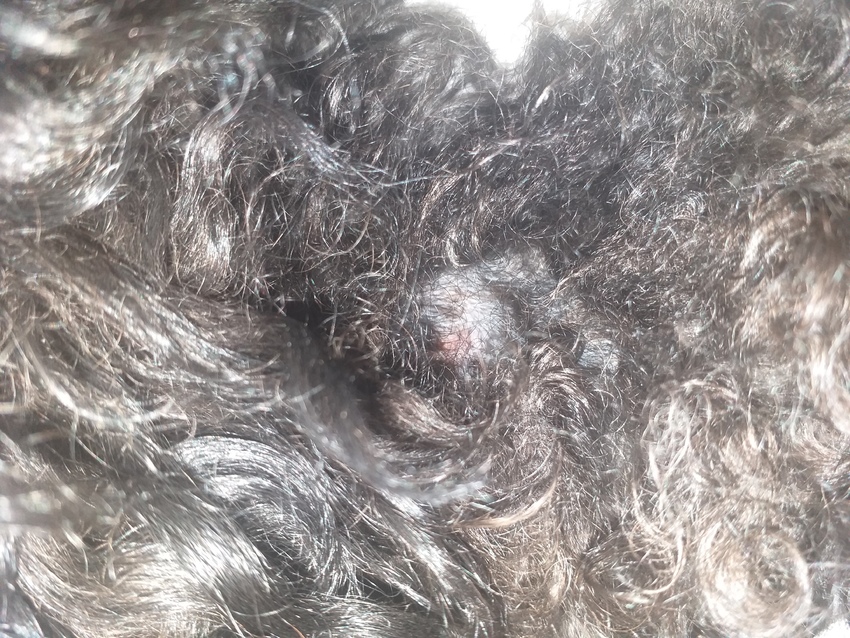 Ik heb geen langharige/krulvacht hond dus ik heb hier geen ervaring mee, maar ik zou zelf denk ik de haren eromheen weg scheren. Zorgen dat het voorlopig kort blijft om die plekken heen zodat er voldoende lucht bij kan. Dan gaat het minder broeien en heb je kans dat het sneller geneest. Overleg dit anders eerst eens met de trimmer zodat je het eventueel samen kunt doen (zelf met een scheerapparaat bij wondjes in de buurt komen zou ik niet doen).
