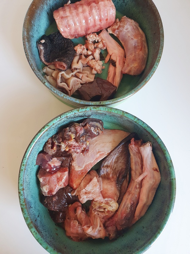 Dus elke week eens vleugels, boutjes , 1×per week nekjes ,jonge zachte ribben , koppen blieft de dame niet . En verder eens een hele kwartel of een deel van een heel wild konijn of gans . Ze is klein , dus dat eet ze niet In 1 x op