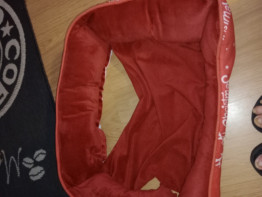 Onder dat rood zat een laag vulling en dan een zwart laagje stof. Ik ga m weer dicht maken en dan doe ik er een vast kussen in zodat het niet stuk gaat als hij gaat graven.