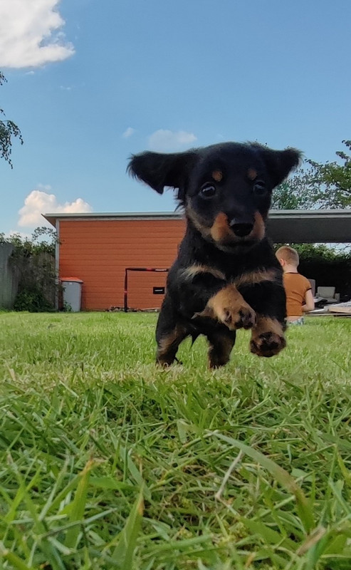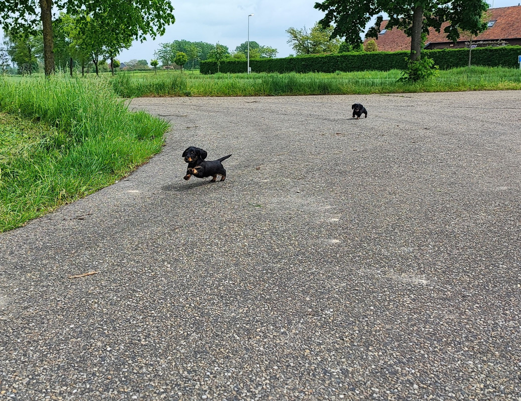 Heel goed op de momenten dat het weer mee zit gaan ze naar buiten is echt genieten om te zien hoe vrolijk en open ze zijn, we hadden ons geen beter eerste officieel teckel nestje kunnen wensen
