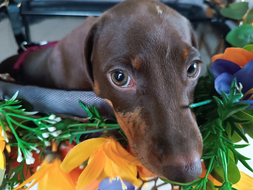 Een paar dagen na de oproep plaatst een goeie kennis van me, die al 2 teckeltjes heeft, een foto van haar nieuwe hondje.