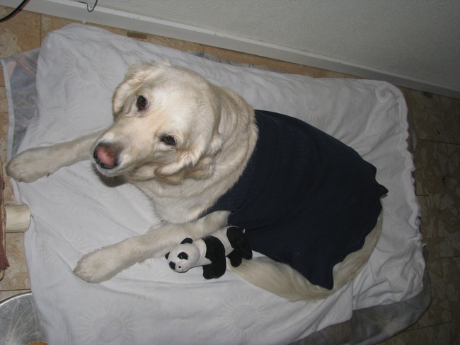 slapen doet ziggy heel de dag al, ze zit nog half onder de narcose, maar ze heeft al geen 24 uur eten gehad, ze moet een gekke soepjurk aan, ze zit onder de medicijnen, ze hebben een zalf op haar buik gedaan waar ziggy's tere huidje blijkbaar niet tegen kan. dus haar buik ziet helemaal geel. en ze waggeld door het huis als een dronke hond. echt sneu om te zien, maar dit vind ze denk ik minder erg dan om de 9 maanden een onderbroek te dragen.