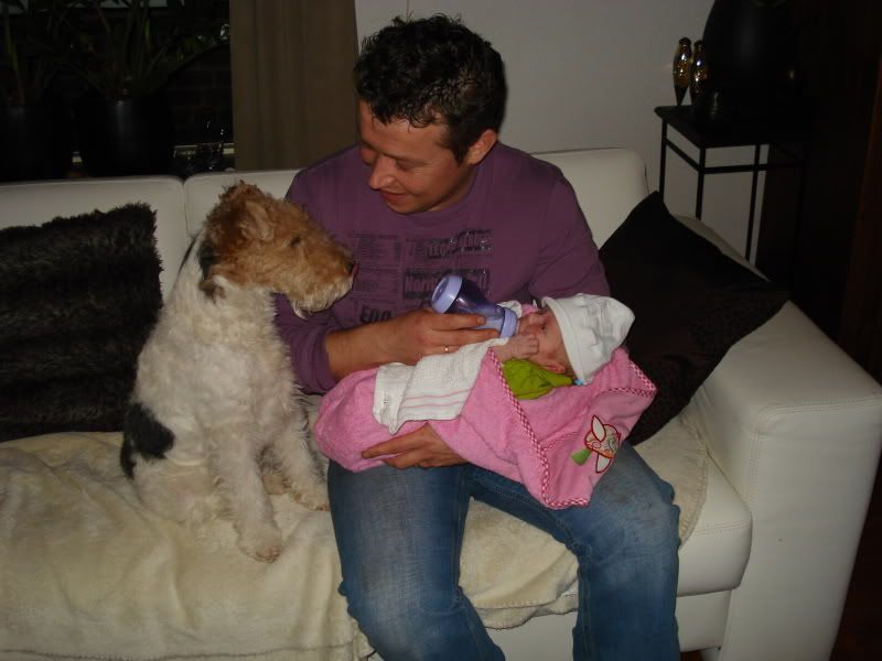 Het zal voor hem ook wel lekker ruiken. Ook als de fles leeg is, en Fenna een dikke boer laat, zou Morris het liefst haar even lekker in het gezicht likken, maar zelf vind ik dat niet zo smakelijk...God weet, wat er allemaal aan z'n sik hangt. Tevens kietelen die haren ook in haar gezichtje. Zo lang hij maar netjes zo op z'n kontje erbij blijft zitten, vind ik dat hij zich heel goed aanpast. We bouwen het nu iedere dag een beetje op, zodat het straks wel goed zal gaan...Op het huilen reageert hij gelukkig al helemaal niet. Het gaat vast goedkomen....Ook al blijven we heel voorzichtig met hem....