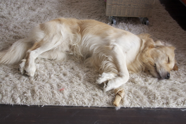 Als het kleed er niet op ligt mogen de honden er ook niet op en dan is de bank creme kleurig