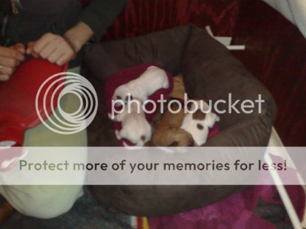 " En hadden tijdens de bevalling van iedere pup, de pups in een ander mandje gelegd met een warme kruik daaronder. Dus, wij na de 7e, de pups terug leggen. Na uiteindelijk alle pups bij de tepels gelegd te hebben, krijgt mevrouw weer een perswee