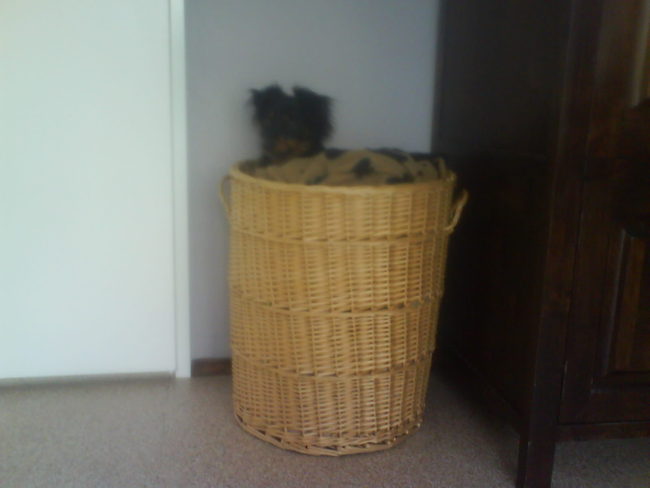Dus als mijn vrouwtje in bed ligt sluip ik naar de mand en spring ik erin.