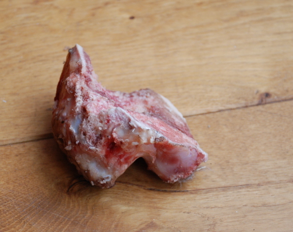 Kijk, we gingen naar de slager en toen kreeg mijn baasje van de slager, omdat ik zo zielig in de auto zat dit ehhh, runderbot mee, maar het is een halve schenkel